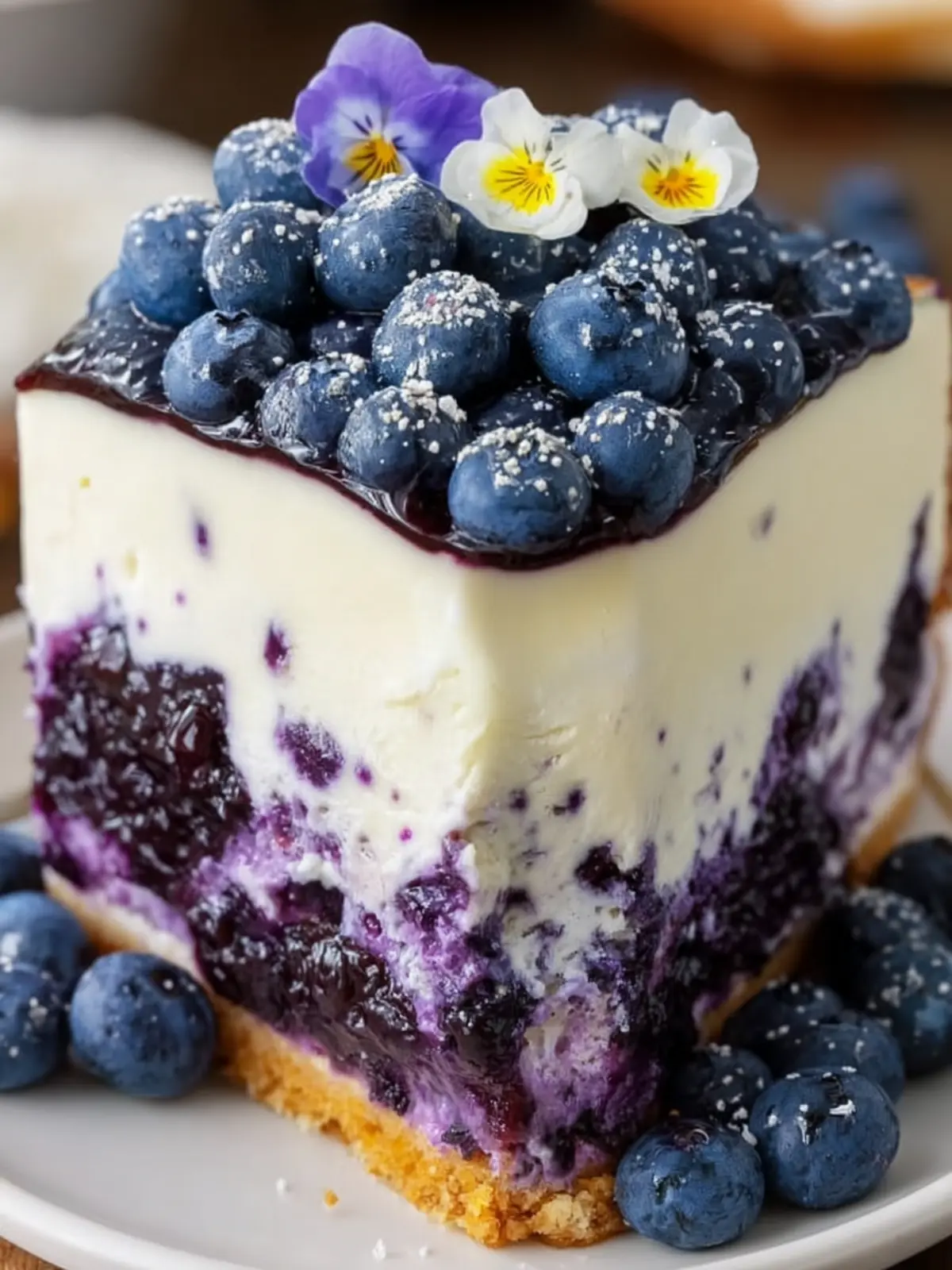 6. Garnish and Serve: Before serving, top with the remaining fresh blueberries and sprinkle with powdered sugar. Garnish with edible flowers for a decorative touch.