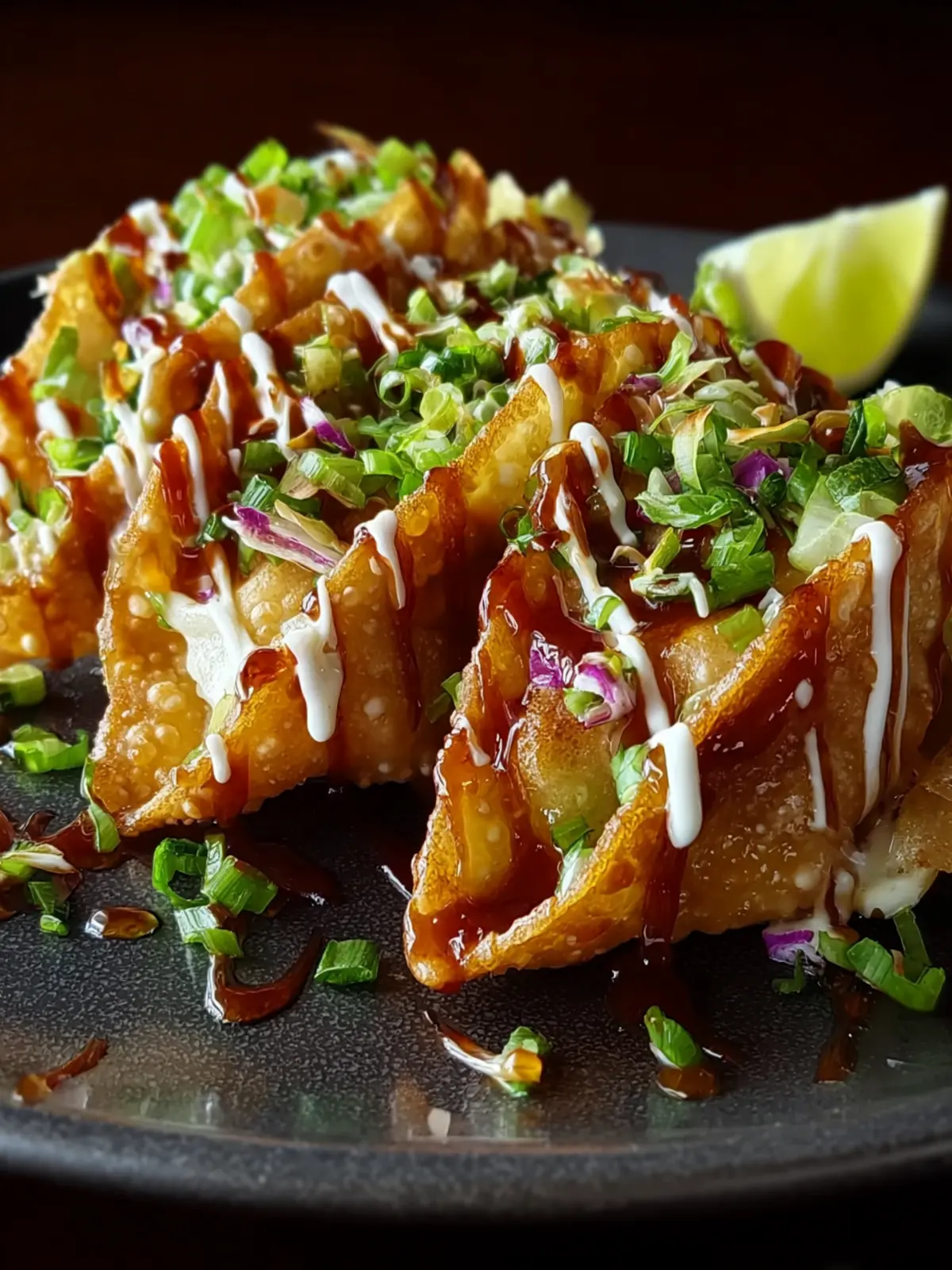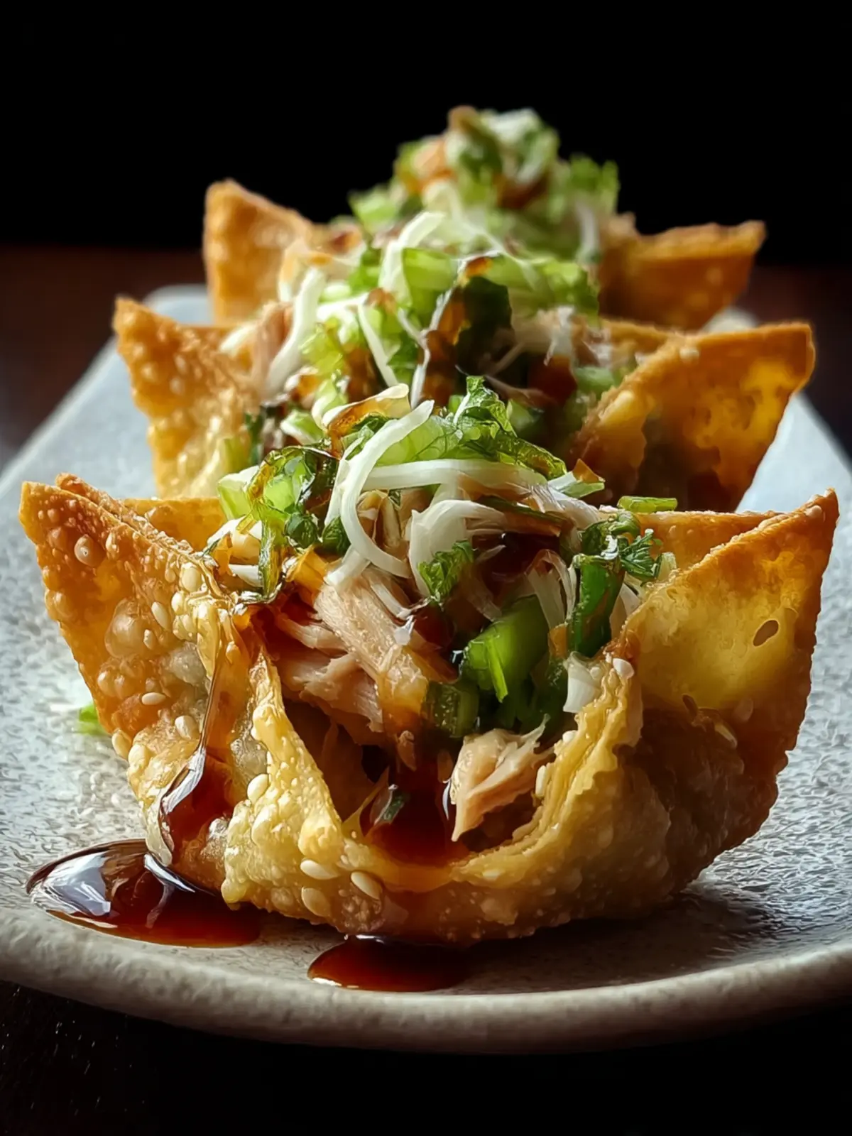 Delicious crispy wonton tacos filled with savory chicken and fresh ingredients.