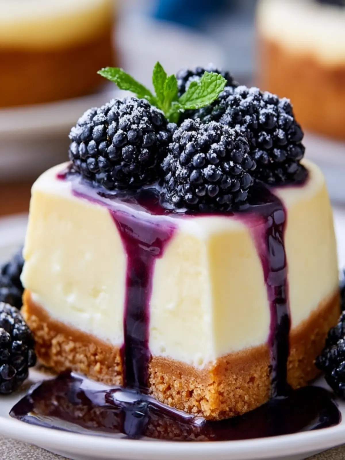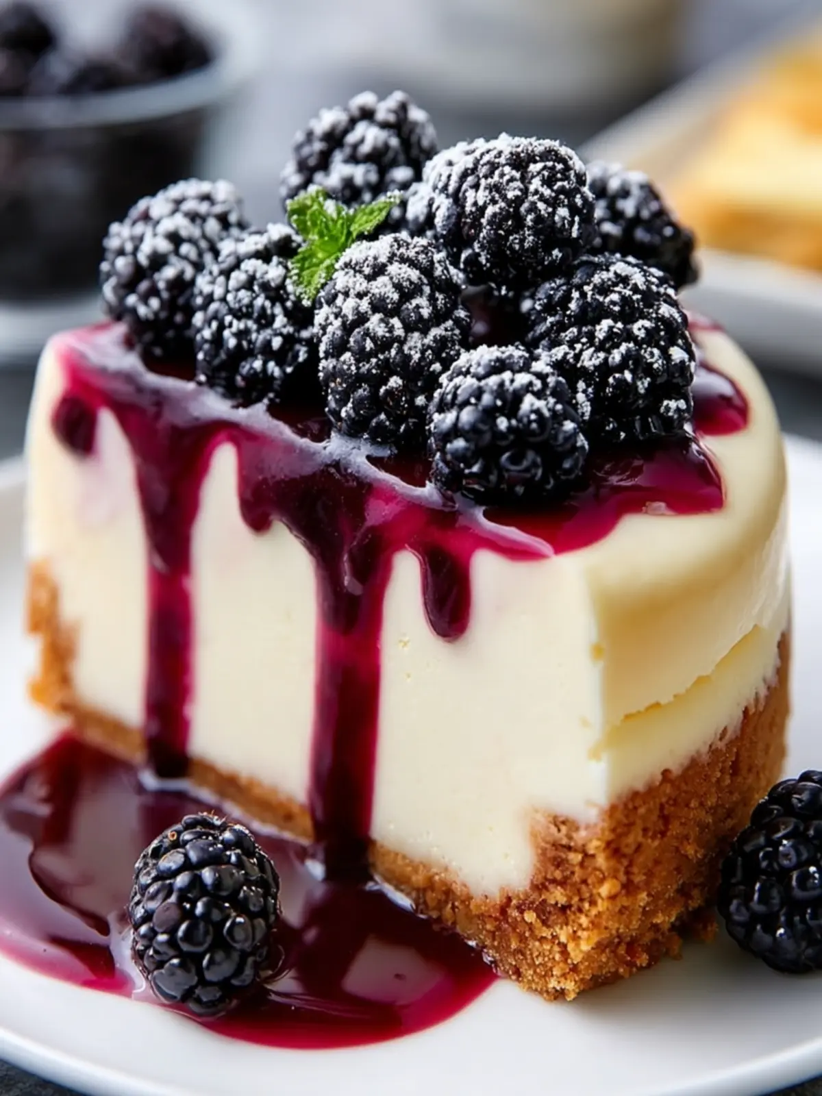 Texture Balance: The smooth, creamy cheesecake pairs wonderfully with the slightly juicy blackberries on top, creating an irresistible contrast in textures that keeps each bite exciting.