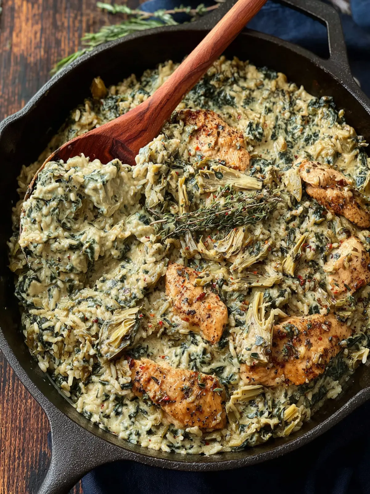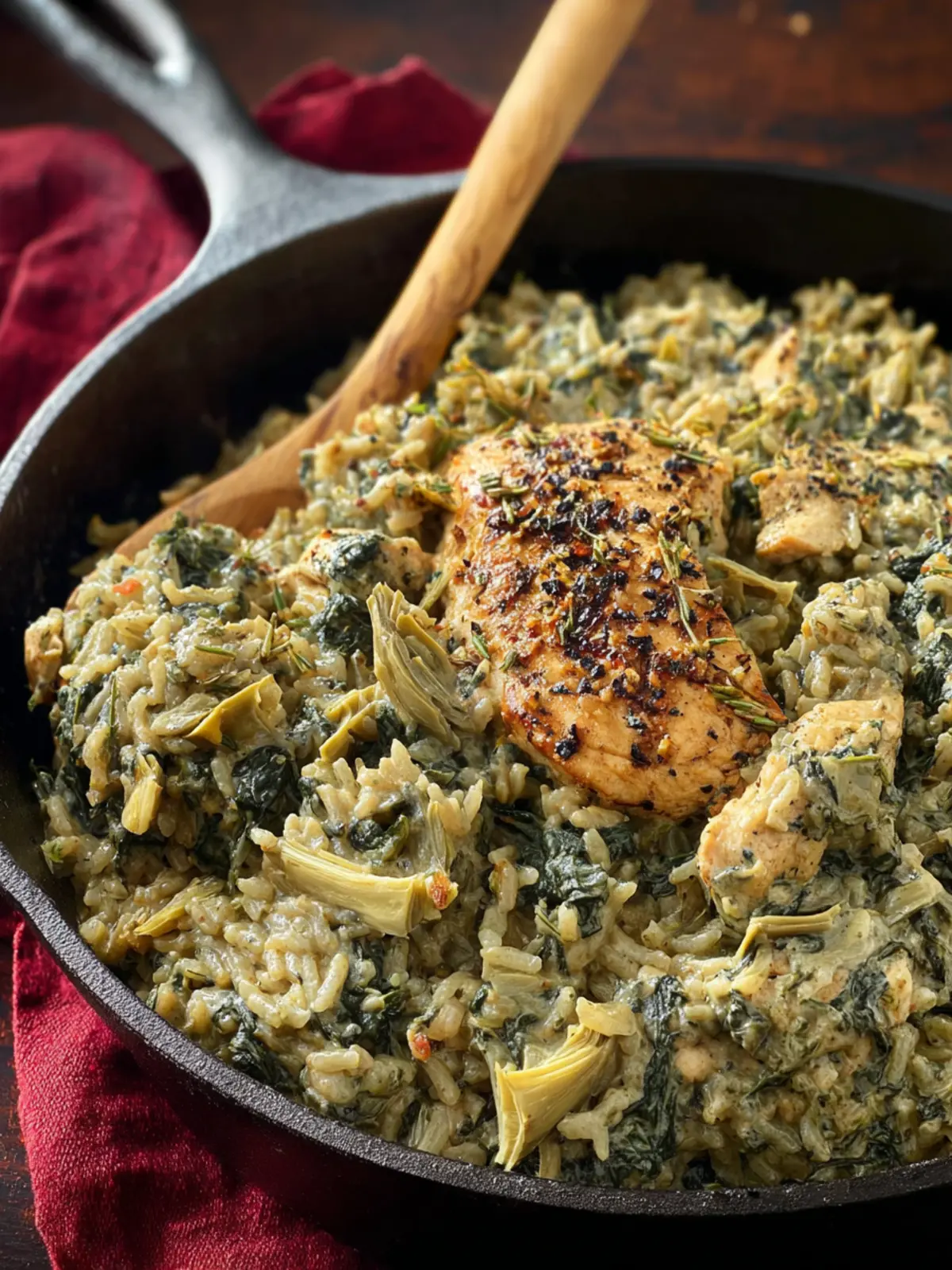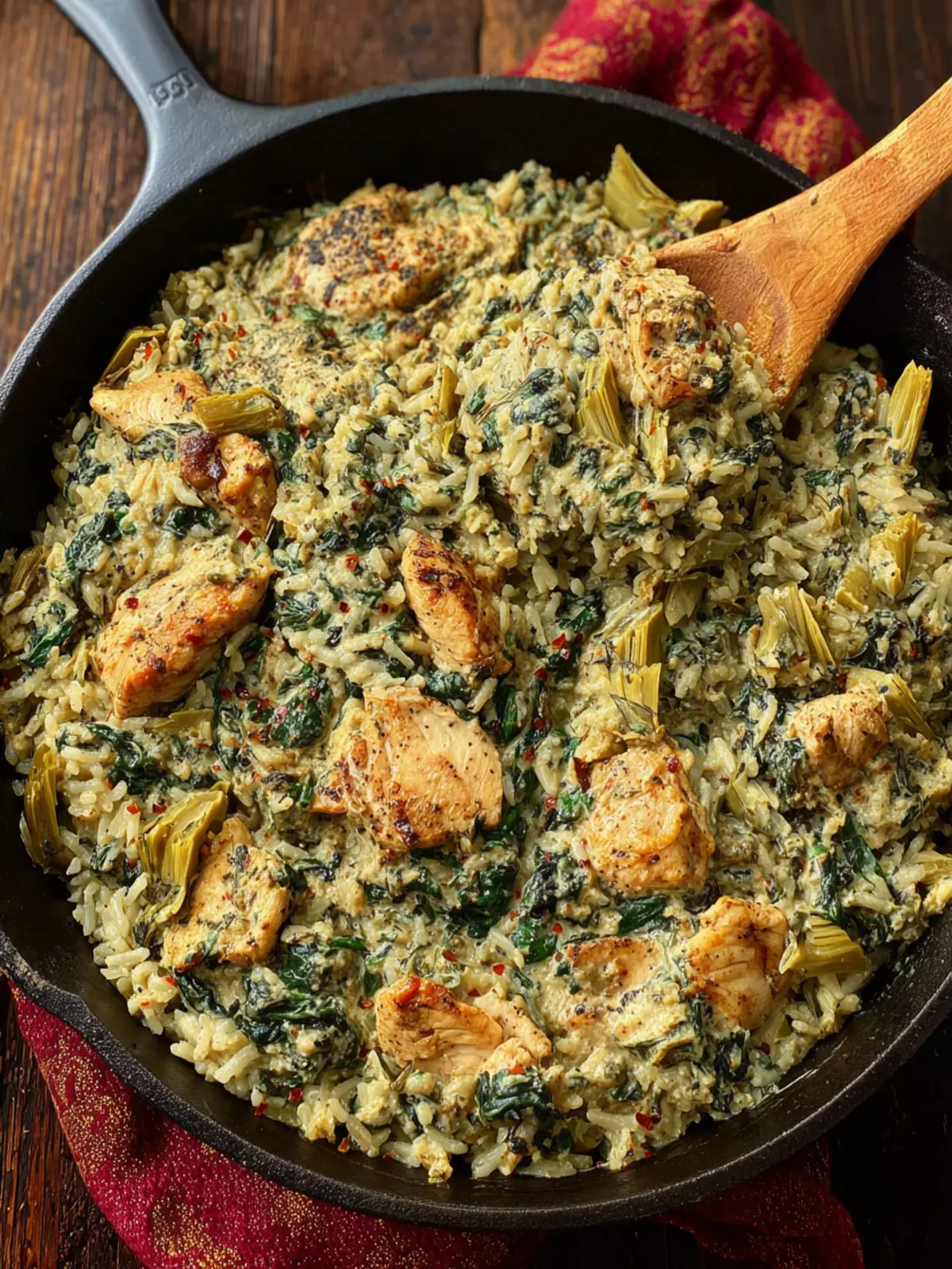 A creamy and flavorful chicken and rice dish with fresh spinach and artichokes.