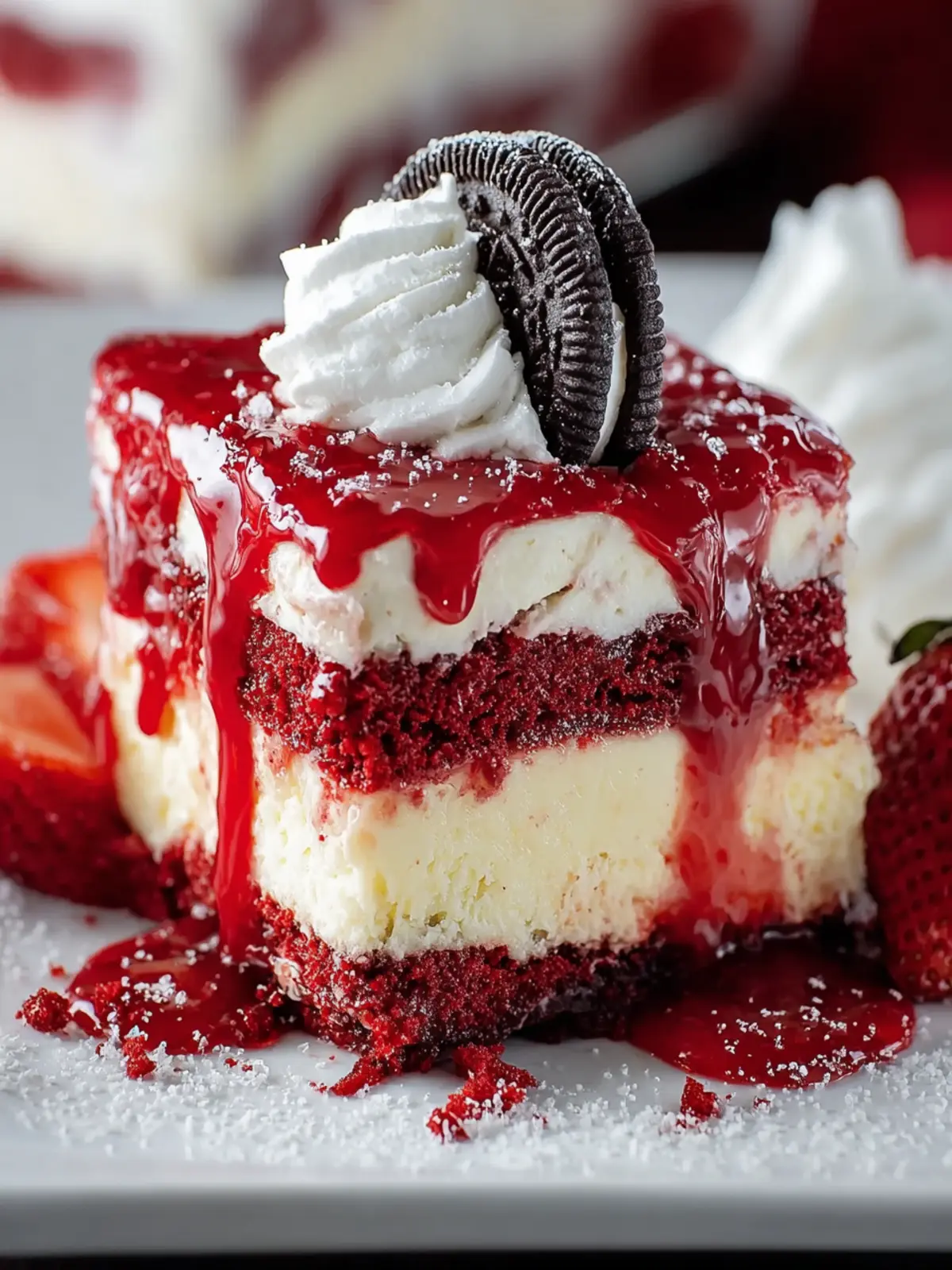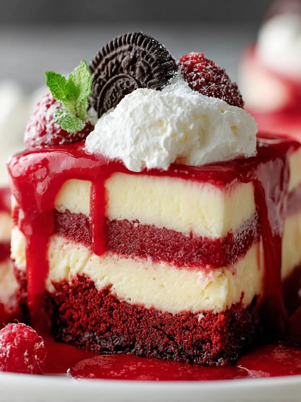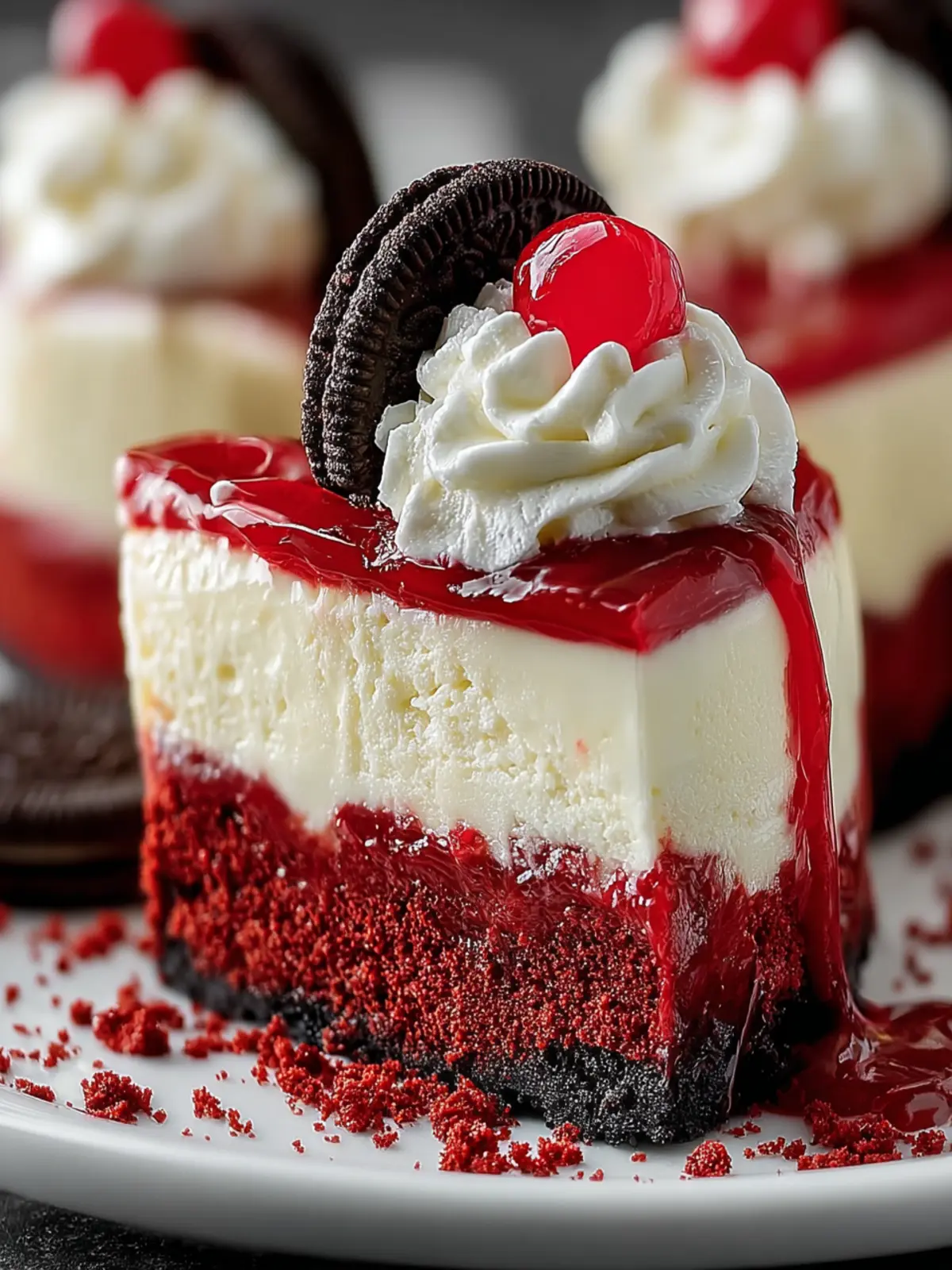 A rich and creamy red velvet cheesecake layered with a chocolate crust and topped with whipped cream.