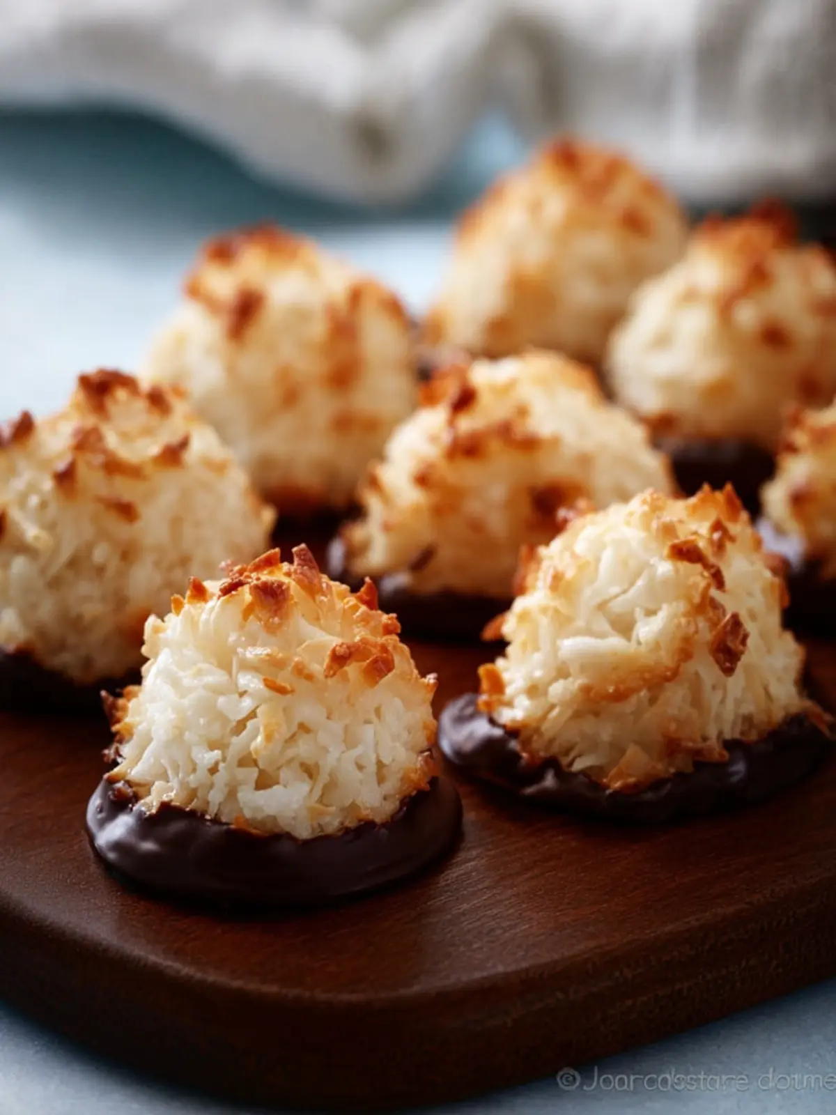 Delicious and chewy coconut macaroons dipped in chocolate.