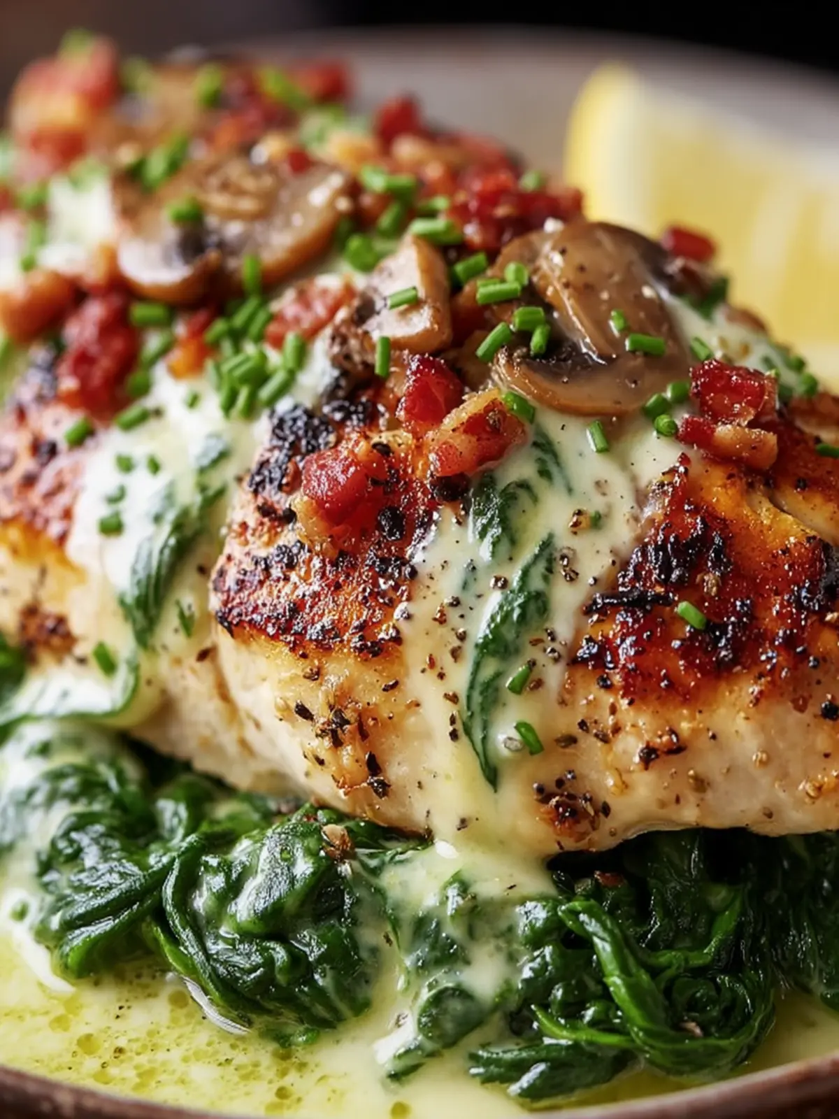 - Combine and Serve: Place grilled chicken breasts on a serving plate. Top each with creamy spinach sauce. Sprinkle crumbled bacon over the top for garnish.