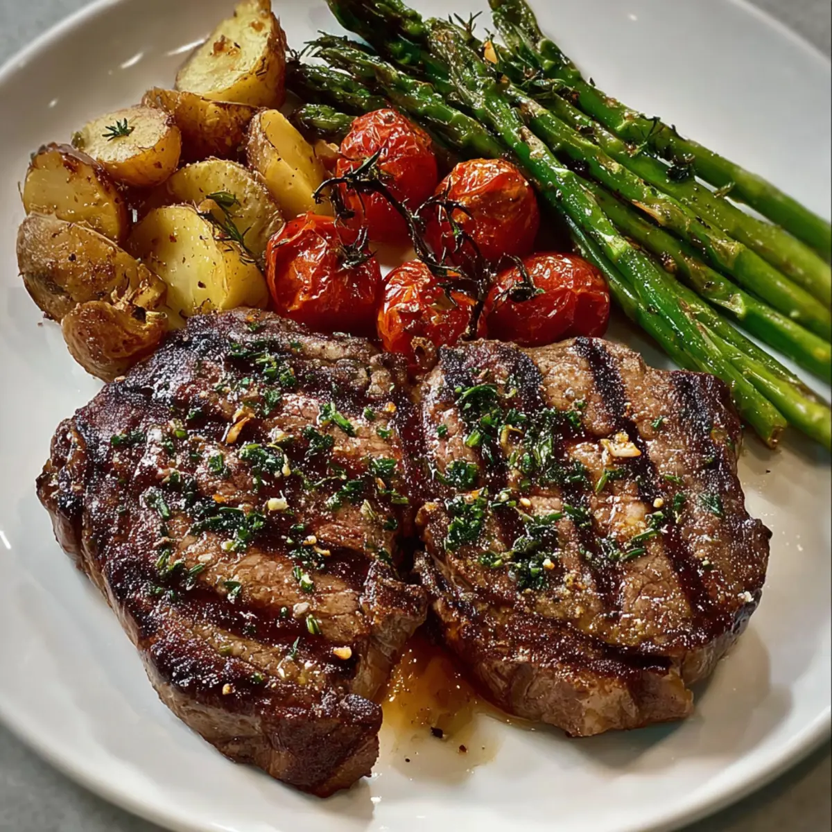 Delicious grilled ribeye steaks seasoned with fresh herbs, served alongside asparagus and cherry tomatoes.