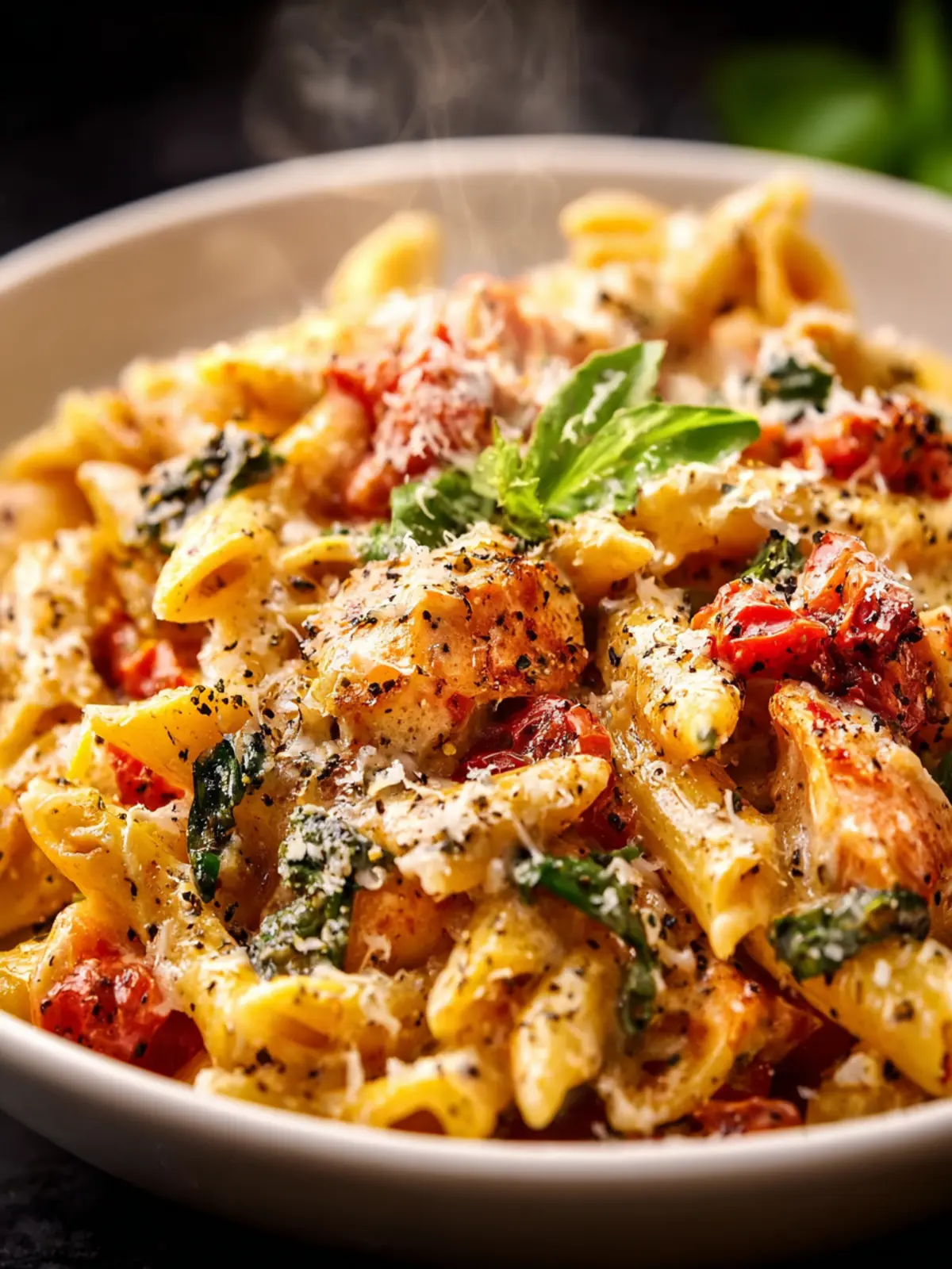 A delicious creamy chicken pasta dish featuring sun dried tomatoes and spinach.