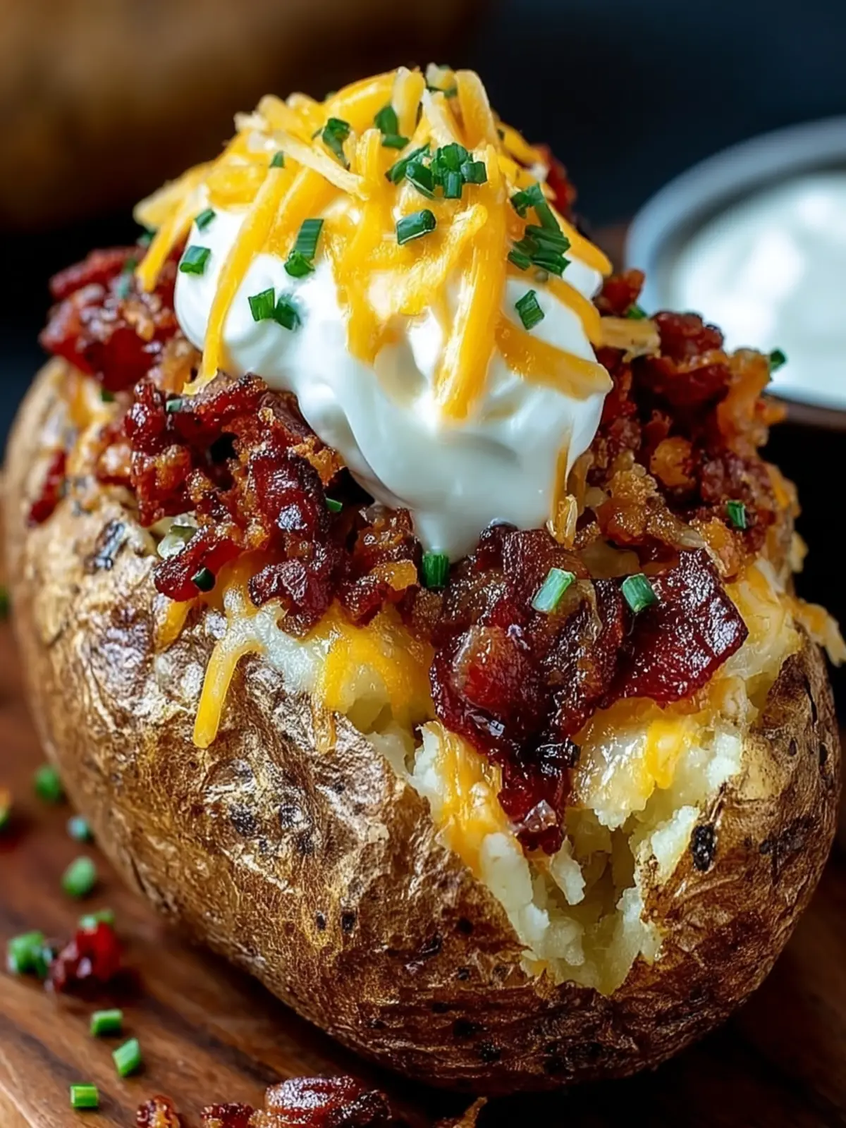 - Top with Bacon and Sour Cream: Add crumbled bacon on top, followed by a dollop of sour cream. Sprinkle with chopped green onions for a fresh finish.
