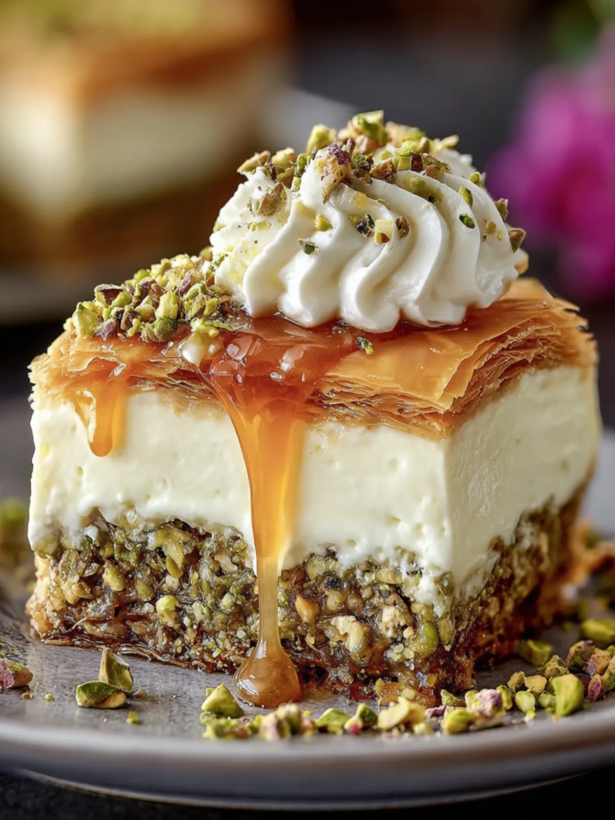 A delightful fusion of baklava and cheesecake featuring layers of phyllo dough, creamy cheesecake, and a rich honey syrup.