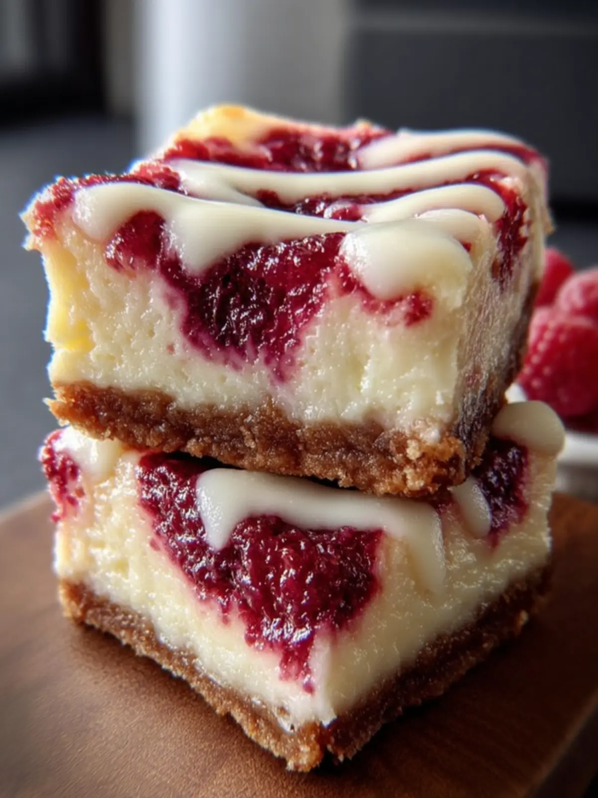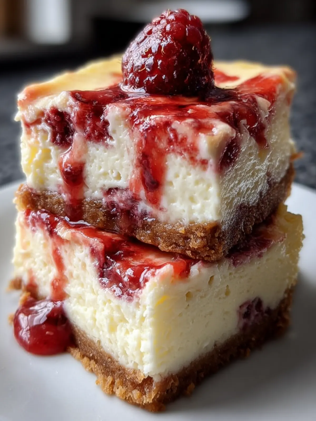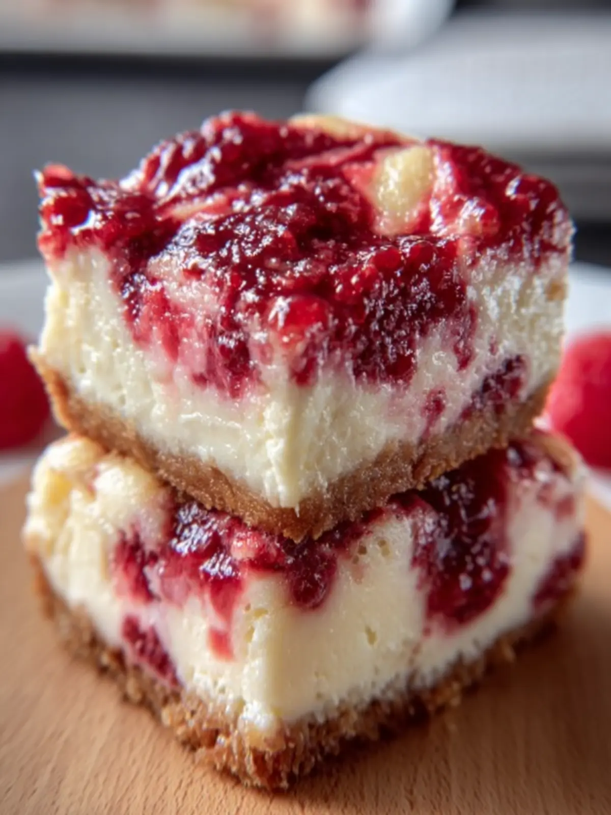 The blend of creamy cheesecake with the bright, tart raspberry swirl strikes a perfect balance. Each bite is a delightful contrast, with the smooth richness of the cheesecake complementing the fresh, fruity tang of the raspberries. Plus, the buttery, crumbly crust adds an irresistible crunch, making these bars pure joy to eat.