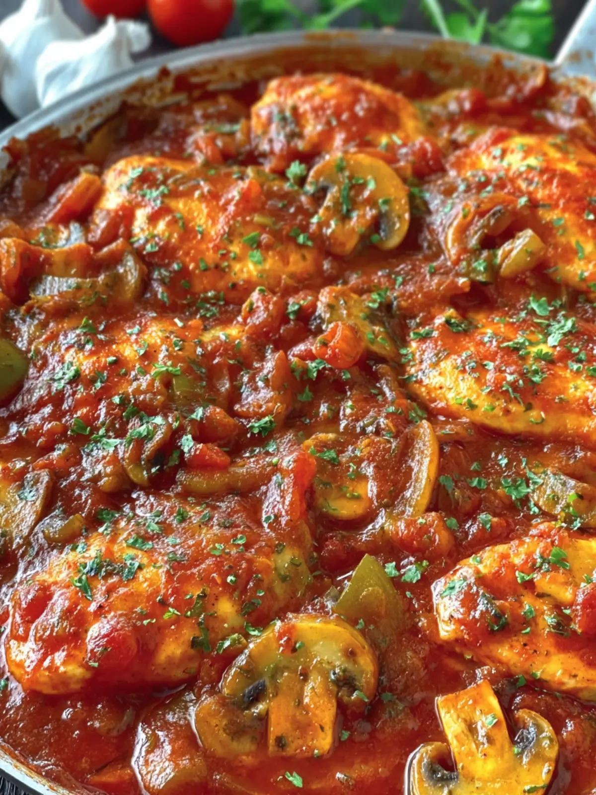 A delicious dish featuring chicken breasts simmered in a rich marinara sauce with mushrooms and herbs.