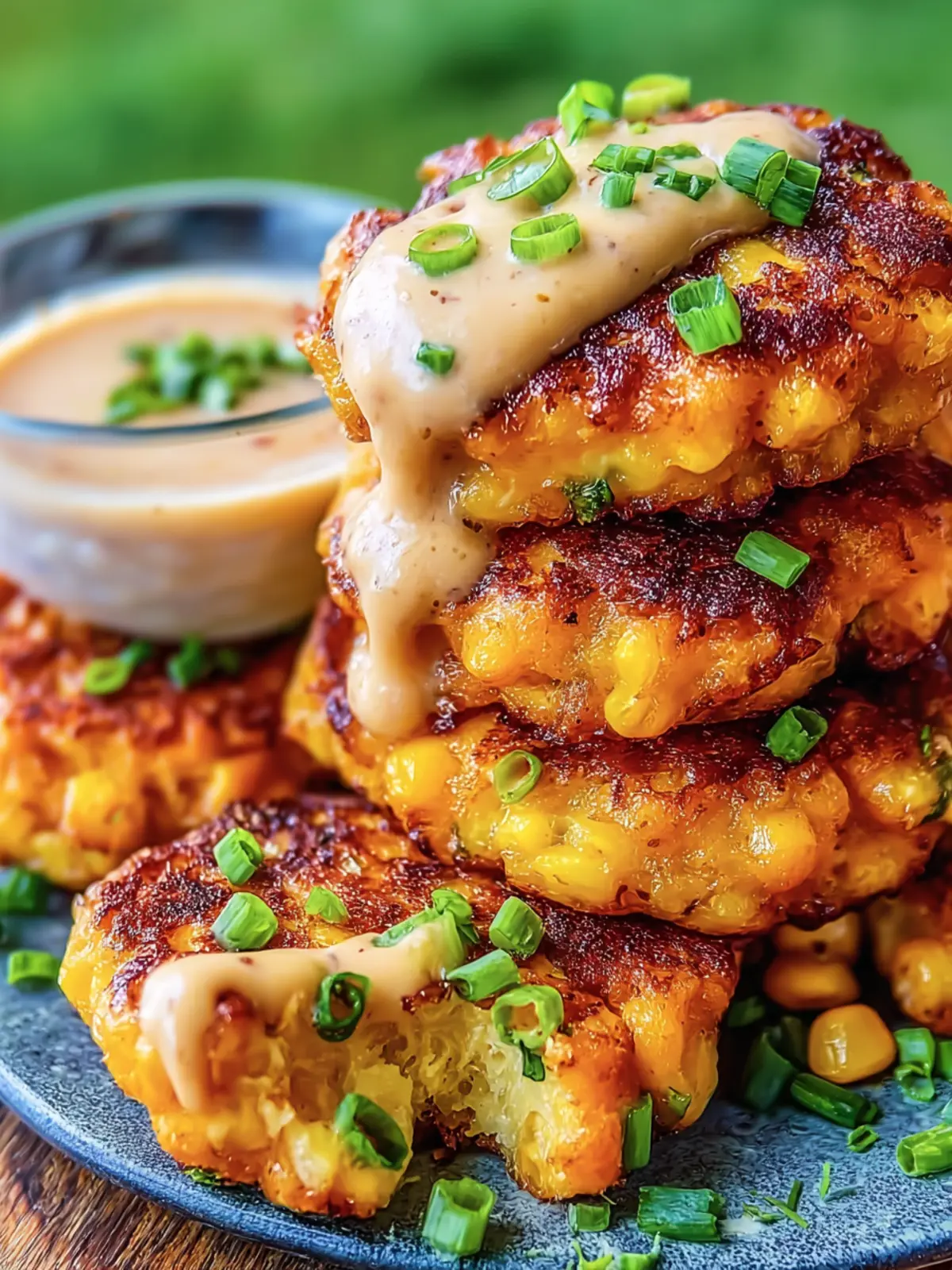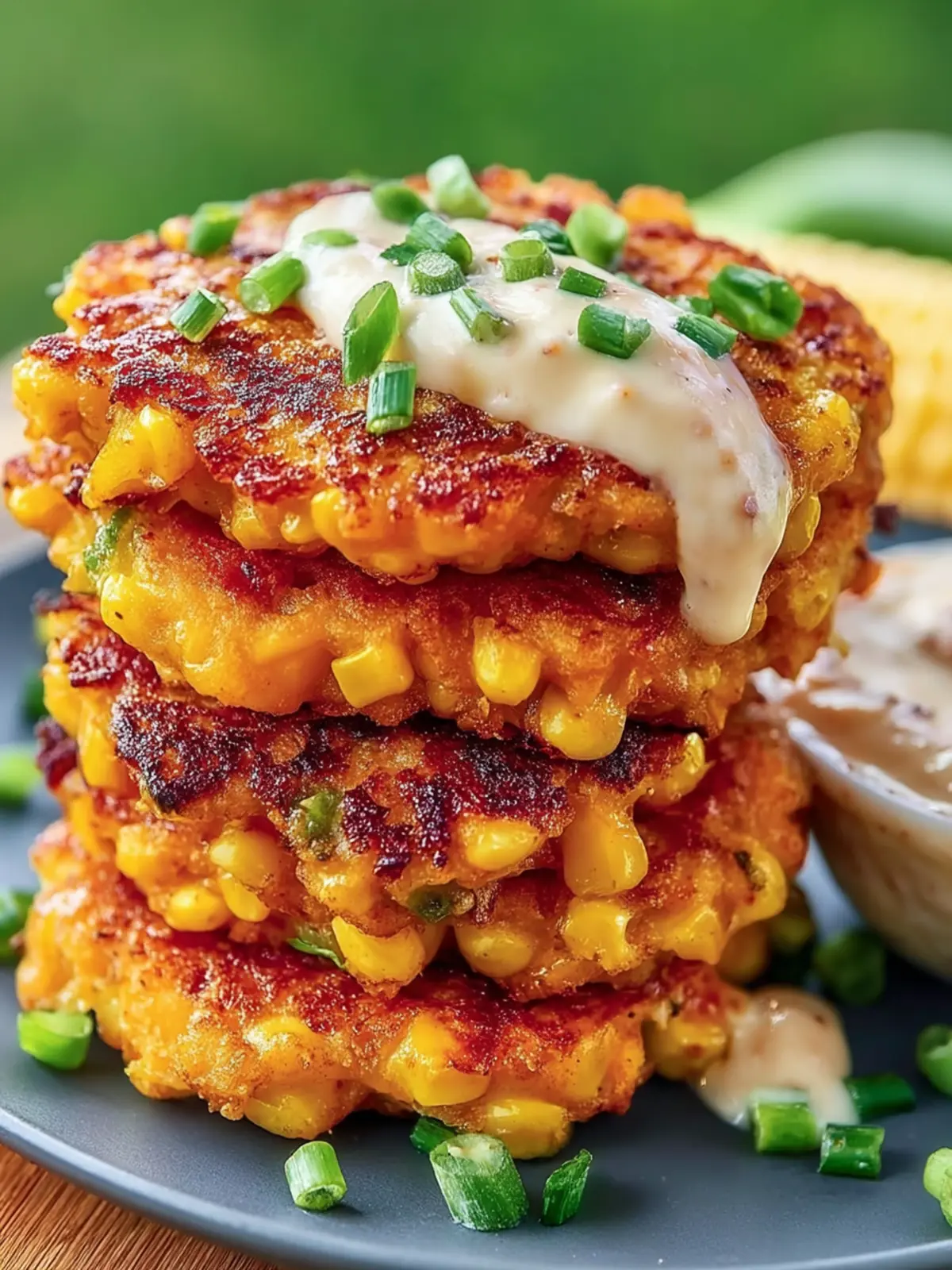 4. Assemble the Dish: Stack the fritters on a serving plate. Drizzle the creamy sauce over the fritters. Garnish with chopped green onions.