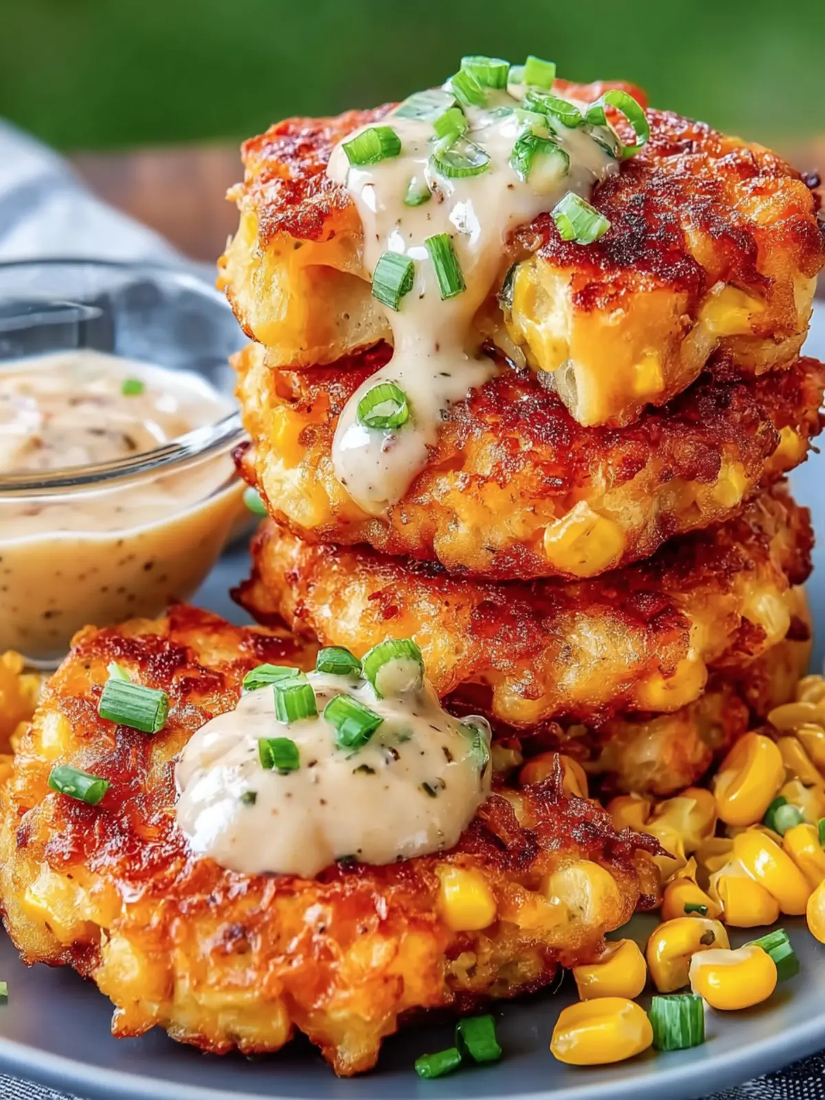 Delicious and crispy corn fritters served with a creamy sauce, perfect for a snack or appetizer.