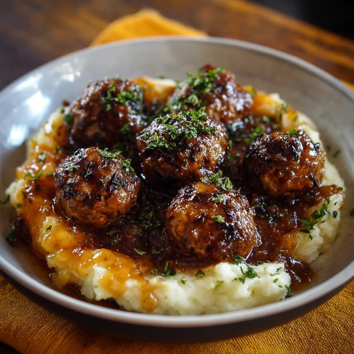 A delicious recipe for savory meatballs served with creamy mashed potatoes.