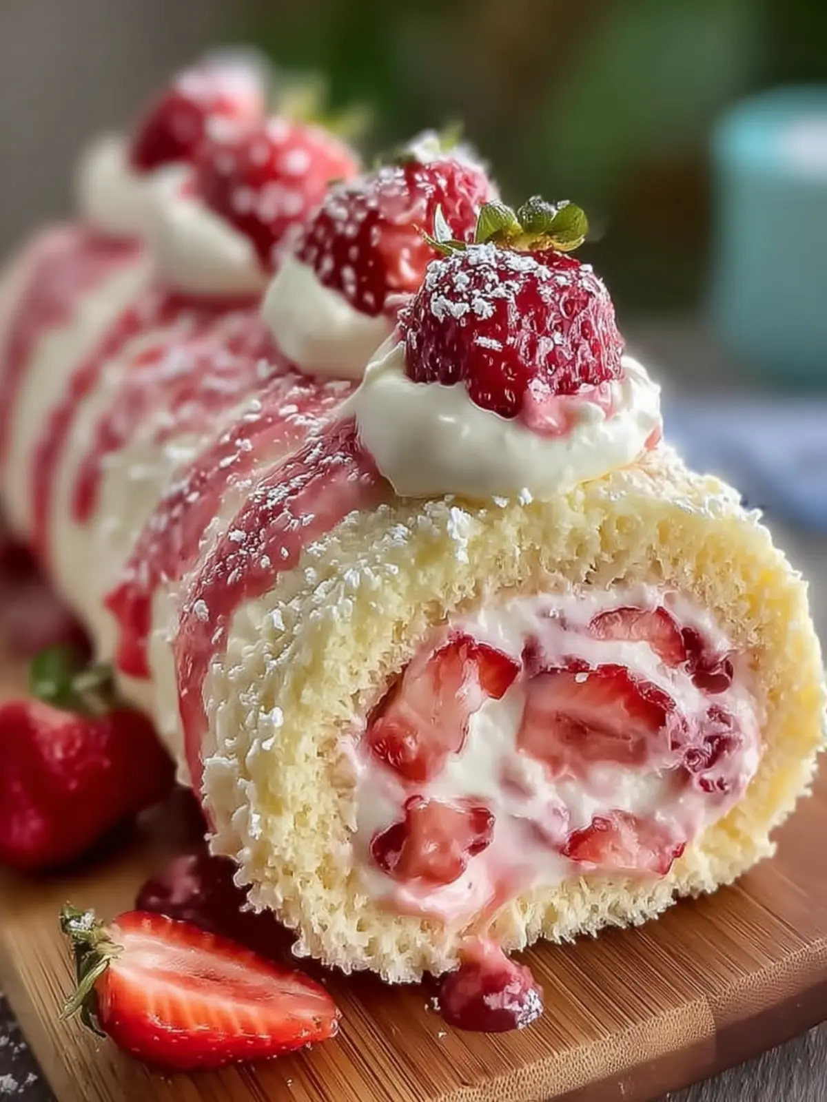 A delightful strawberry cream roll cake filled with fresh strawberries and whipped cream, perfect for any occasion!