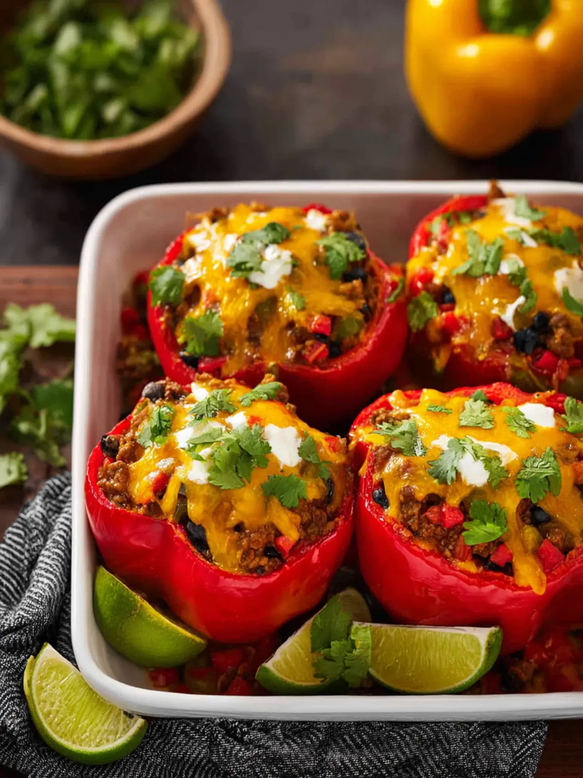 Delicious stuffed bell peppers filled with savory ground beef, beans, and topped with melted cheddar cheese.