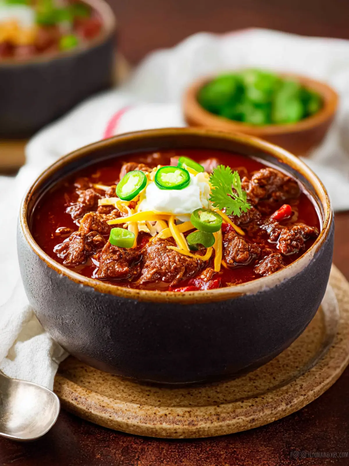 Sour Cream: A dollop of sour cream can temper the heat and add a creamy texture that balances the chili’s robust flavors.
